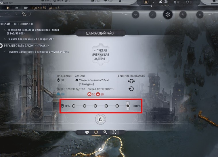Рост параметра рабочей силы также проявится, если повысить производительность производства. В первую очередь, добиться нужного эффекта нам помогут чрезвычайные смены, которые активируются нажатием специальной кнопки.