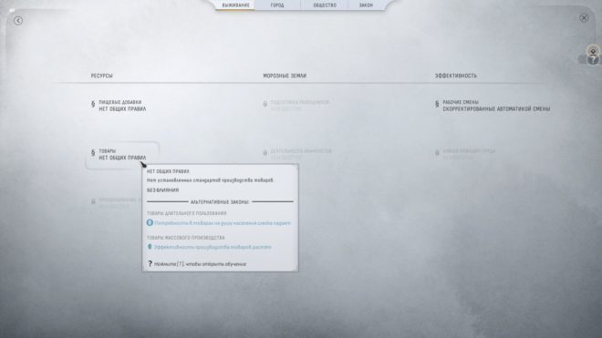 Товары массового производства (его можно найти в закладке "Выживание", он доступен с начала игры и позволит существенно повысить количество выпускаемых товаров, снизив уровень преступности).
