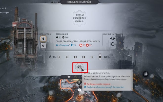 Рост параметра рабочей силы также проявится, если повысить производительность производства. В первую очередь, добиться нужного эффекта нам помогут чрезвычайные смены, которые активируются нажатием специальной кнопки.