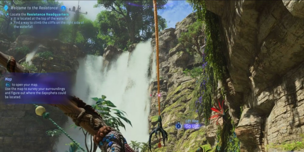 Игра сообщит вам, что штаб-квартира Сопротивления находится рядом с водопадом, но не скажет, где этот водопад. Вы можете обратиться к своей карте, чтобы посмотреть, где он находится, но это все равно мало чем поможет. Однако если вы отправитесь на северо-запад от места встречи с Со'леком, то в конце концов услышите и увидите водопад. Справа от водопада вы найдете предметы, известные как подъемные лозы. Как только вы подойдете к одному из них, вам будет предложено использовать его. Как только вы подниметесь по первой подъемной лиане, игра предложит вам сбить другую подъемную лиану с помощью лука и стрел. Как только вы подниметесь по ней, все, что вам нужно сделать, - это следовать по уже проложенному пути. Вы увидите желтовато-оранжевые палатки, которые означают присутствие Сопротивления в этом районе. Когда вы подойдете к палаткам достаточно близко, перед вами появится всплывающее окно с надписью "Штаб Сопротивления". Оттуда вам нужно войти в главные двери и найти Со'лека.