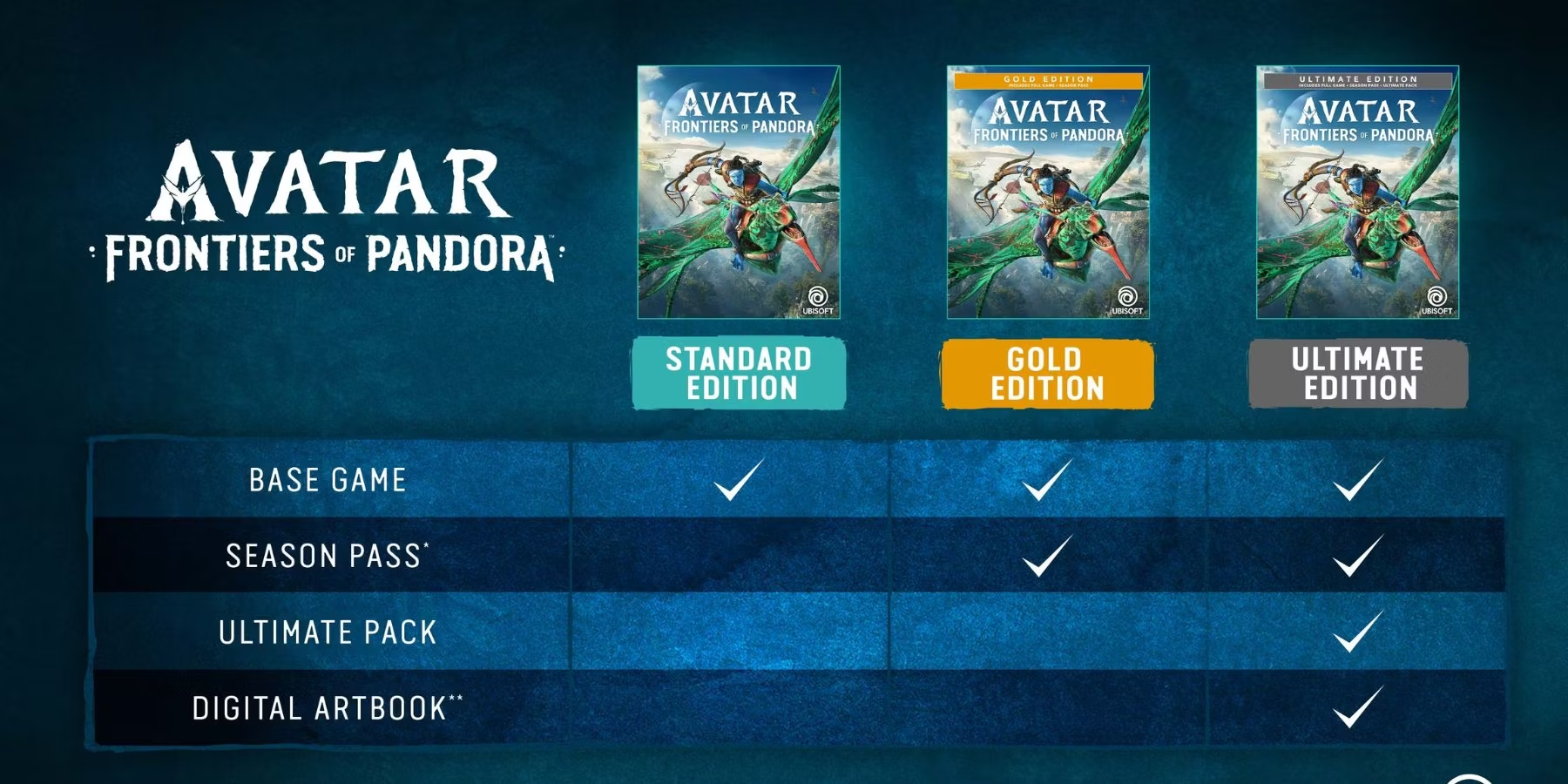 Видеоигровая адаптация фильма "Аватар" от Ubisoft, Frontiers of Pandora, предлагает четыре издания: Standard, Gold, Ultimate и Collector. (Специальный физический комплект доступен только в некоторых магазинах и регионах).