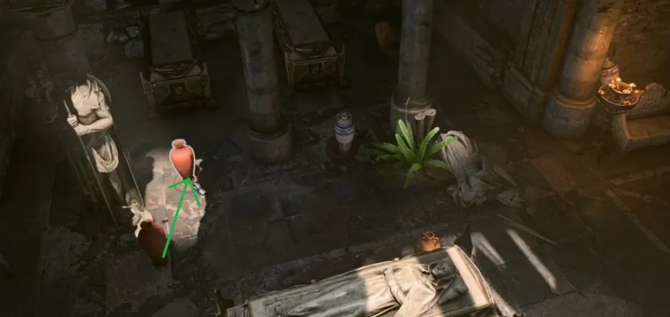 Игроки могут выбрать предметы, например, вазы или ящики в этой комнате, и перетащить их, чтобы закрыть шесть вентиляционных отверстий на полу. Это предотвратит выделение газа, и огненным стрелам будет не на чем детонировать. Игроки, не обладающие высоким восприятием, могут не заметить некоторые из этих пластин. В этом случае обратитесь к следующему рисунку.