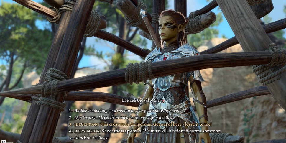 Вы можете просто напасть на тифлингов, чтобы избавиться от них, хотя они не обязательно злые. Проверка навыка "Убеждение" требует только броска на пять и убеждает их отпустить ее. Затем вы можете решить, сражаться ли с ними, чтобы убить Лаэ'зель, или встать на ее сторону, чтобы сразиться с дуэтом тифлингов. Проверка навыка "Обман" требует броска 10 и убедит их покинуть клетку, чтобы они могли вернуться в свой лагерь. После этого Лаэ'Зель потребует освободить ее.