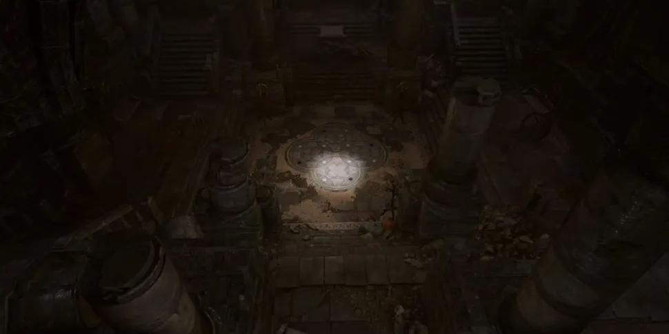 Следуя по коридорам, вы найдете комнату с четырьмя вращающимися кругами на полу, каждый из которых имеет несколько заполненных и пустых слотов. Игроки должны повернуть эти взаимосвязанные платформы таким образом, чтобы все четыре пустых слота оказались на нижней окружности, куда светит свет сверху. После этого переключите рычаг в другом конце комнаты и спуститесь в подземный мир, а именно на заставу Селунита.