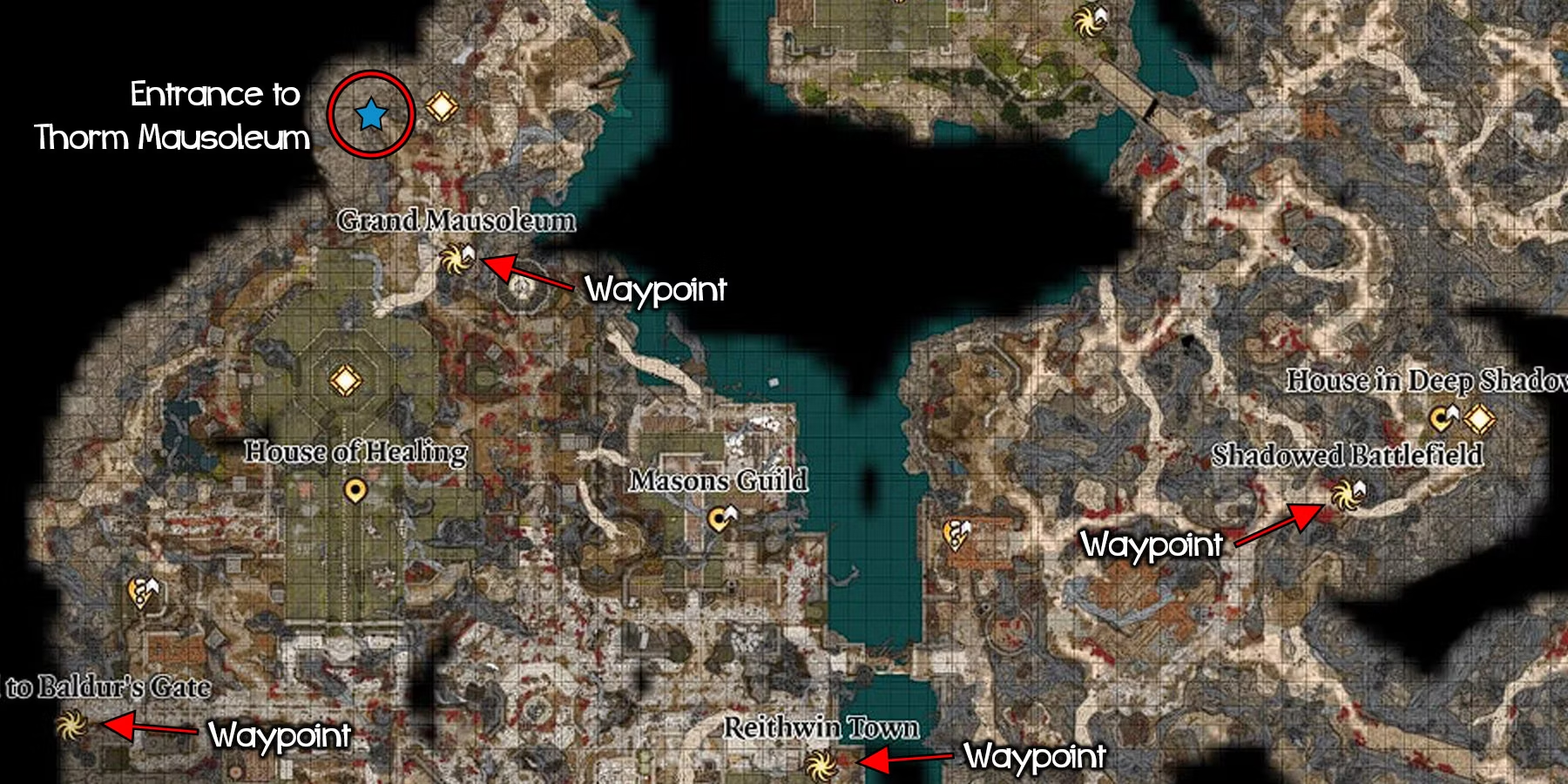 Сначала игроку и его команде нужно будет пройти мимо Дома исцеления и Большого мавзолея, чтобы попасть ко входу в Мавзолей Торма по координатам (X:-118 Y:112). Внутри каждого мавзолея можно найти стандартный набор лута, а также собрать два дневника Малуса Торма и Запятнанную книгу, если они попадутся при разграблении. В этих книгах содержатся подсказки для решения головоломок, с которыми игроки столкнутся в мавзолее Торма, а также некоторые предыстории.