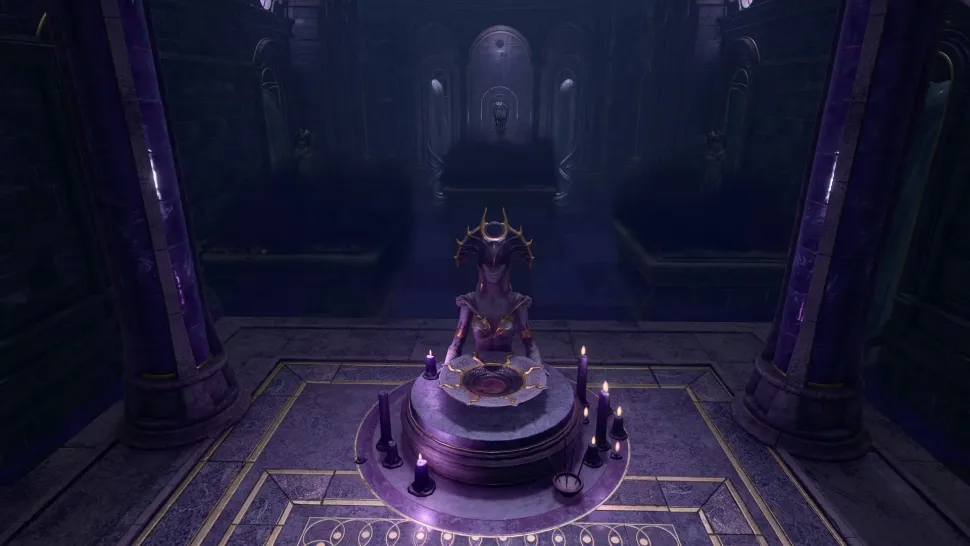 Чтобы увидеть, куда именно должна идти Шэр, попросите игроков встать у входа в испытание, а затем переведите камеру на темную область за алтарем. Если присмотреться, то в кажущемся пустом пространстве между тремя статуями можно заметить фиолетовые блоки. Однако эти блоки исчезают, когда к ним приближается член партии, поэтому, чтобы безопасно пройти комнату, игрокам необходимо запомнить, где они находились.