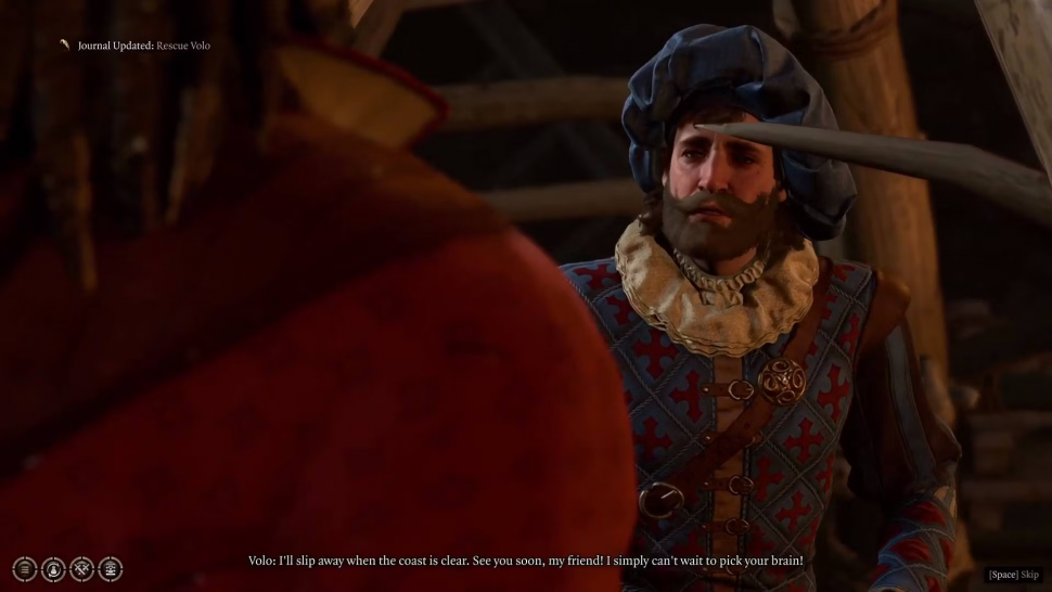 Пройдя мимо охранников и попав в лагерь гоблинов, игрок увидит Воло, выступающего на сцене. Взаимодействие с ним, независимо от выбора игрока, приведет к тому, что его заберет гоблин. На самом деле это полезно, так как позволит игрокам впоследствии спасти его.