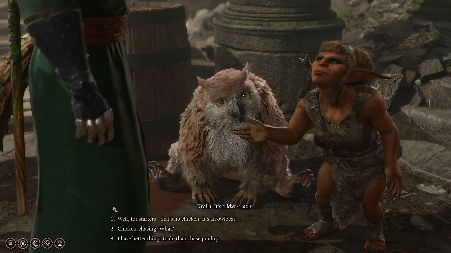 В любом случае, победа в "Куриной охоте" - это удобный способ заработать немного дополнительного золота. Разобравшись с этим, игроки должны отправиться в восточную часть лагеря, чтобы найти путевую точку, которая значительно упростит обратный путь в лагерь гоблинов. Здесь есть гоблин по имени Крушитель, который хвастается своими подвигами, и игроки могут запугать его, чтобы заработать несколько очков у Лаэ'зеля. Убив его, можно получить "Кольцо Крушителя", дающее владельцу +3 м передвижения. Игроки, выбравшие происхождение "Dark Urge", получат здесь уникальную диалоговую опцию.