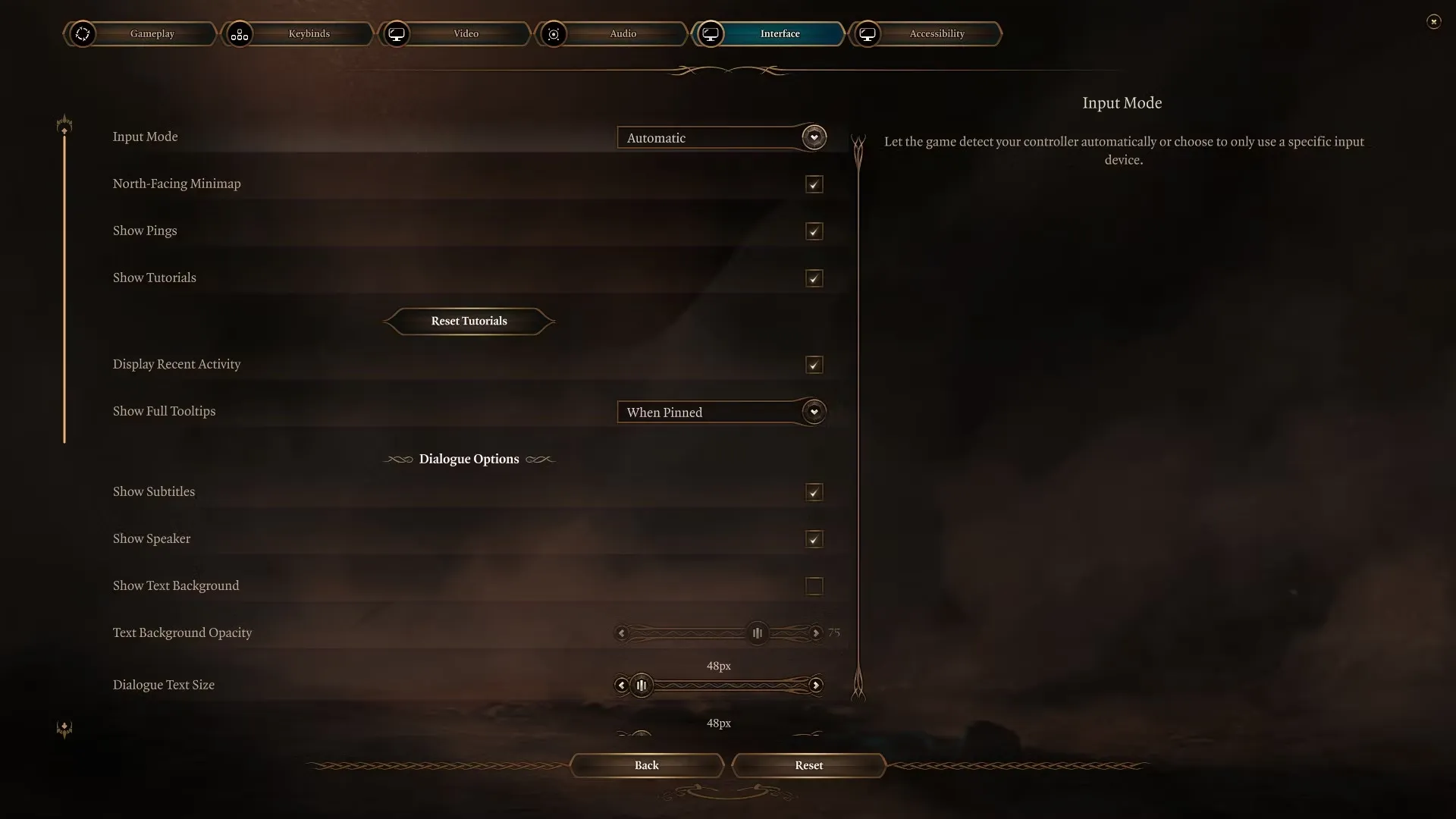 В настройках Baldur's Gate 3 по умолчанию для параметра Inputs установлено значение "Auto", что означает, что игра будет автоматически определять, используется ли клавиатура и мышь или геймпад, и мгновенно переключать экранные элементы управления и входы соответственно.