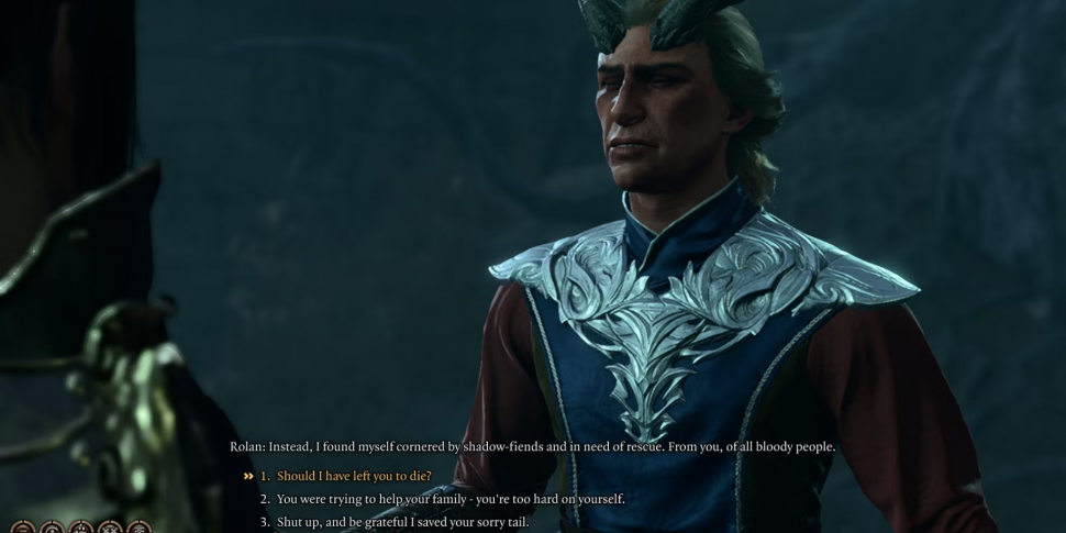 Если игроки поговорят с ним в гостинице "Последний свет" после того, как спасут ему жизнь, Ролан будет немного недоволен - все-таки он не настолько силен, чтобы сделать это в одиночку. Но после спасения тифлингов из тюрьмы в Moonrise Towers и тем самым спасения Кэла и Лии Ролан немного меняет свое мнение.