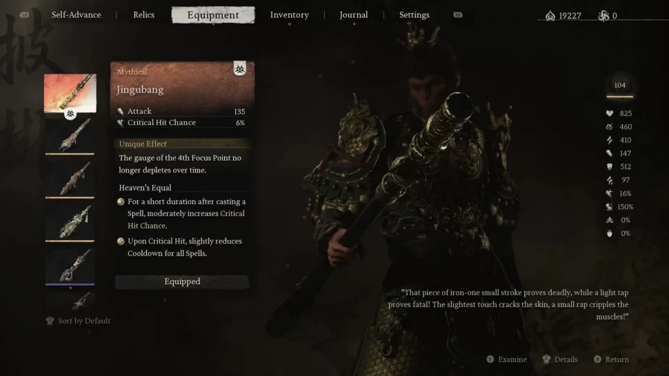 Цзингубан - самое мощное оружие в Black Myth: Wukong, а его уникальный эффект предотвращает автоматическое исчерпание очков фокусировки. Это означает, что вы будете наносить врагам максимальный урон. Кроме того, бонус «Небесный эквивалент» повышает коэффициент критического попадания после использования заклинаний и сокращает время ожидания.