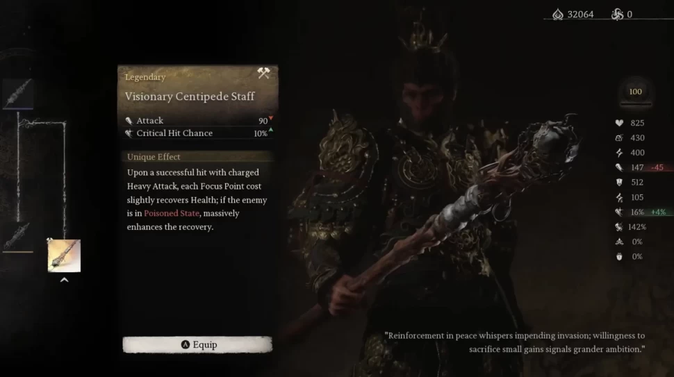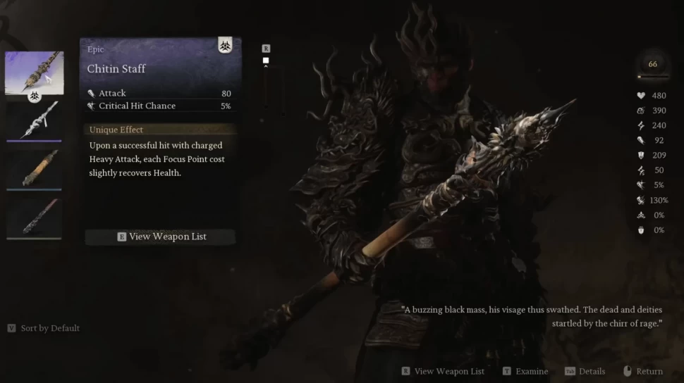 Если вам нужна помощь в обеспечении выживаемости и поддержке атакующих умений, не стесняйтесь использовать Хитиновый посох. Как только вы заполните резервуары очков фокуса, вы сможете наносить безумное количество урона с одного удара. Каждый раз, когда вы наносите тяжелую атаку, очки фокуса будут восстанавливать часть вашего здоровья.