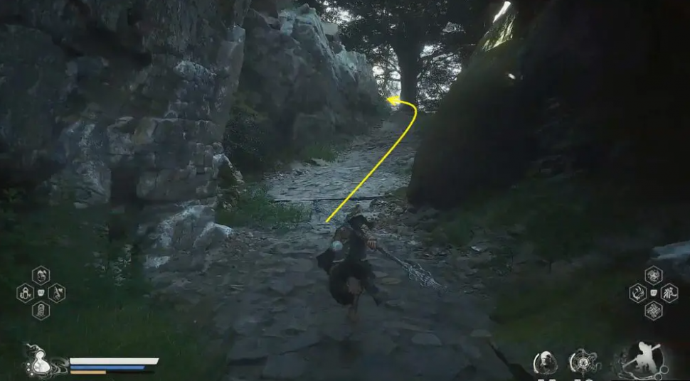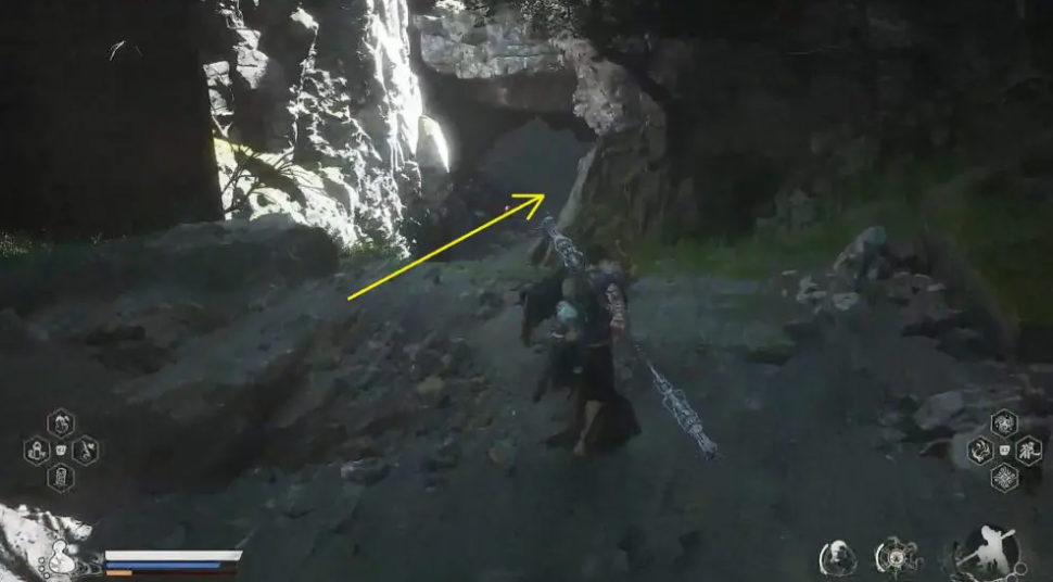 Поднявшись на два лестничных пролета, поверните налево, и вы увидите впереди вход в пещеру, как показано на рисунке ниже. Войдите в пещеру, чтобы найти босса "Ядовитый даос". Победите его еще раз. Затем взаимодействуйте со стеной впереди, как показано на второй картинке ниже, чтобы попасть в секретную зону «Гора фиолетовых облаков».