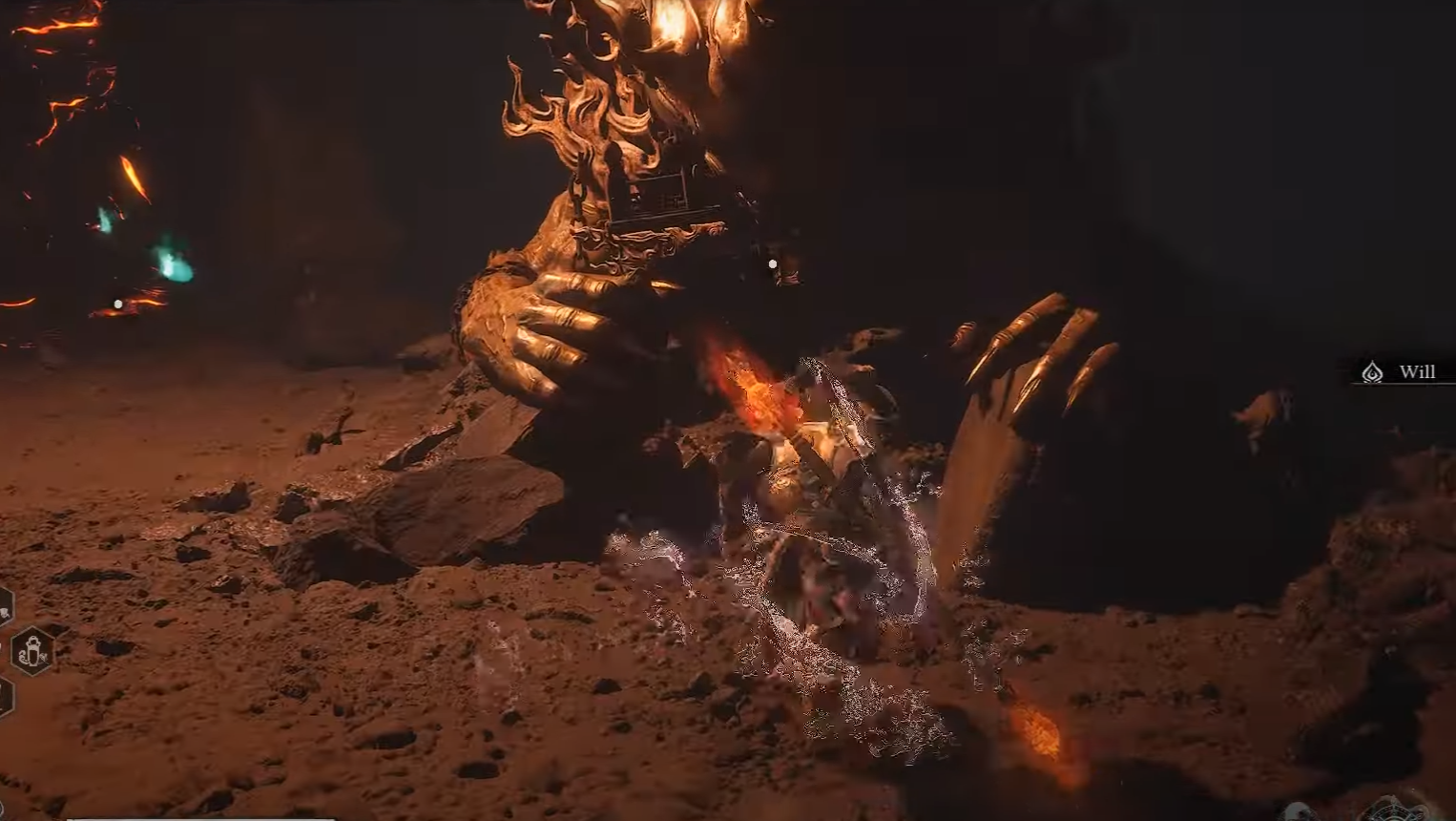 Глава 5 > Огненное поле > Кратер Павшей печи: От кратера Павшей печи развернитесь, идите назад по тропинке, по которой ранее катился большой шар по дороге к этому святилищу. На полпути вниз по тропинке, слева, катящийся шар разрушит барьер. Теперь вы можете спуститься налево и пройти по новому пути, чтобы добраться до босса Флинта Авангарда. После него спускайтесь дальше, пока не дойдете до святилища «Охлаждающий склон». После этого вы увидите большие замороженные ворота. Подойдите к ним, чтобы породить тележку последнего элемента «Ржаво-золотая тележка». Она ранит NPC Быка. Победив тележку, поговорите с раненым NPC Быком, который будет сидеть справа от замороженных ворот. После этого вы сможете взаимодействовать с Замороженными воротами, следуя по линейному пути за ними, пока не получите сцену, которая телепортирует вас в секретную зону «Пещера Бишуй».