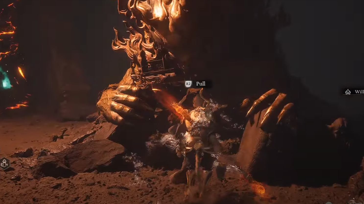 Глава 5 > Долина печей > Вход в долину: От этого святилища идите вниз по тропинке, затем войдите в бассейн с лавой справа. Подойдите к углу лавы, чтобы найти тележку Элемента, застрявшую в лаве, окруженную кучей врагов (тележка не будет атаковать вас). Взаимодействуйте с тележкой, чтобы потянуть за веревку. Завершите все диалоги с ней.