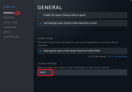 - Введите -d3d11 в опциях запуска и нажмите Ok.