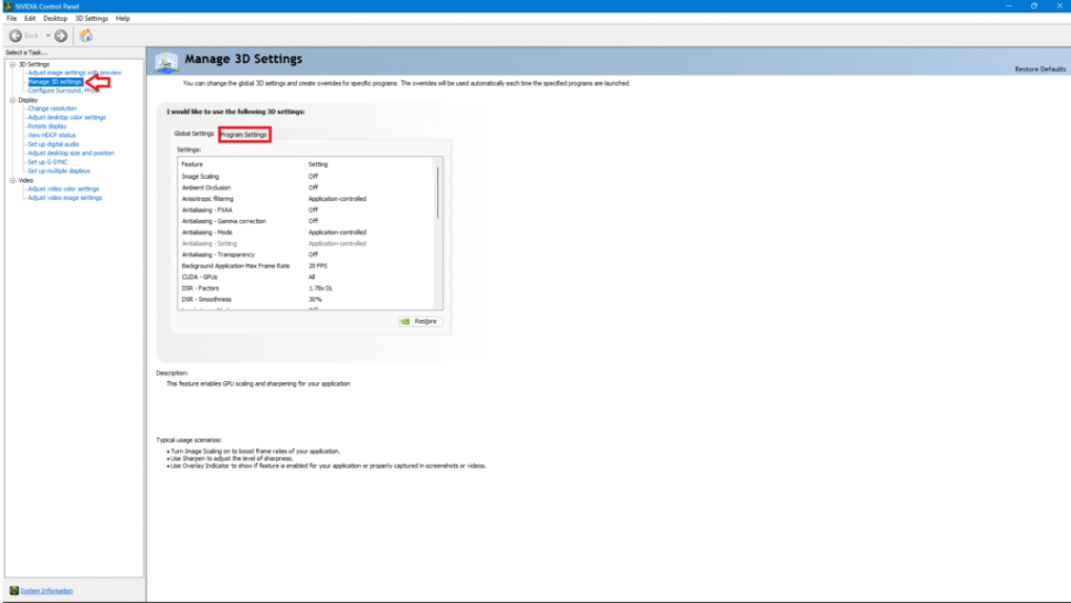 - Нажмите «Управление настройками 3D» и откройте вкладку «Настройки программы».