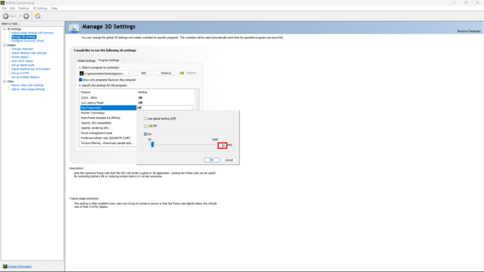 Я рекомендую использовать опцию «Максимальная частота кадров» в панели управления Nvidia, так как внутриигровые ограничители FPS часто вызывают плохую динамику кадров. Здесь описано, как ограничить максимальный FPS с помощью панели управления Nvidia: