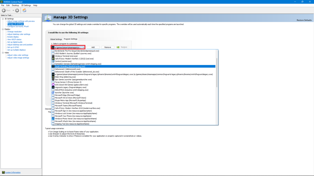 - Нажмите «Управление настройками 3D» и откройте вкладку «Настройки программы».