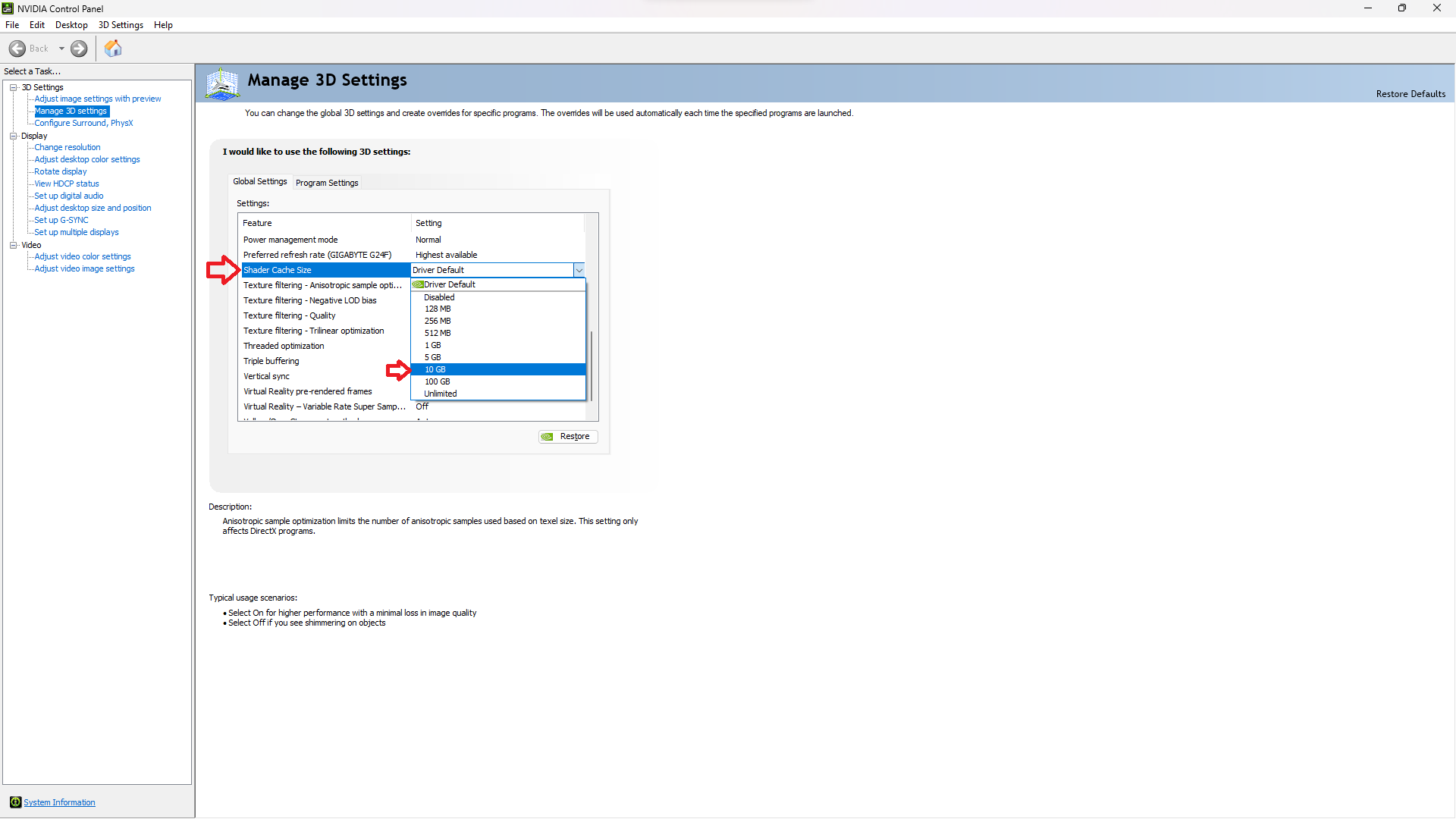 - Перейдите в раздел Управление настройками 3D > Глобальные настройки