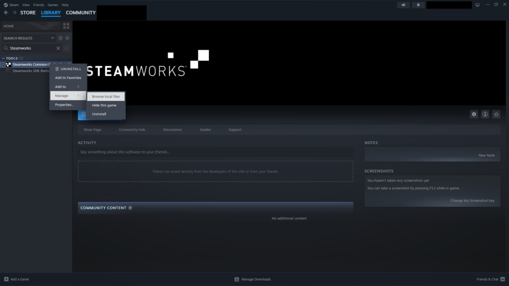 - Щелкните правой кнопкой мыши Steamworks Common redistributables > Управление > Обзор локальных файлов.