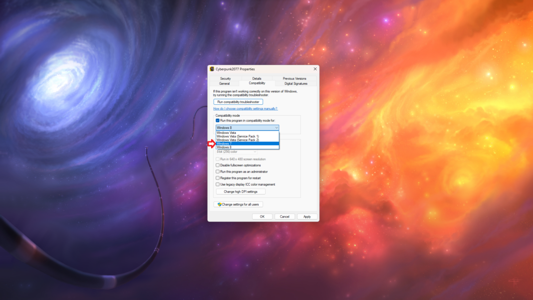 - Установите флажок «Запускать эту программу в режиме совместимости для» и выберите Windows 7 из выпадающего меню.