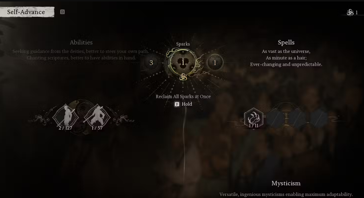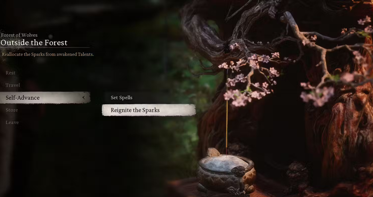 - Под опцией «Самосовершенствование» вы увидите два меню: Установить заклинания и Зажечь искры.