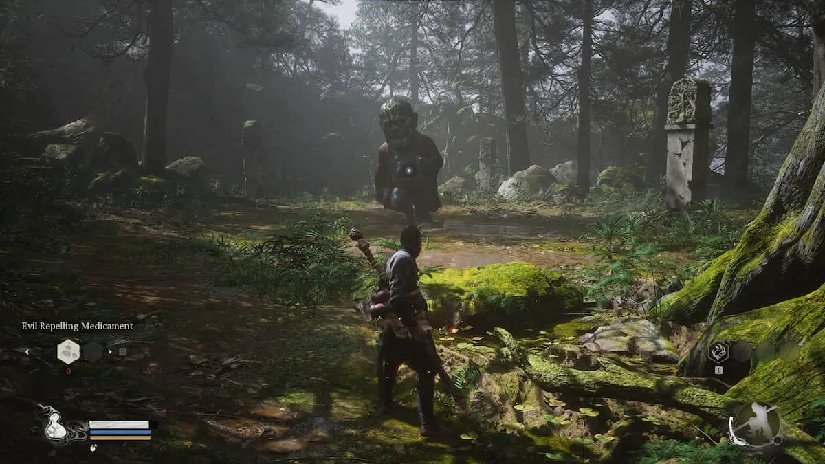Возможно, вам также удастся сбить Блуждающего монаха в каменные столбы, окружающие область, в которой вы сражаетесь. Это хороший способ опрокинуть его на живот, чтобы ему было сложнее встать на ноги в Black Myth: Wukong.