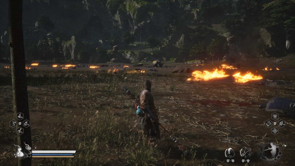 Гора Хуагуо кажется огромной, но на большой высоте в ней легко ориентироваться. Так что садитесь на облако и поднимайтесь, пока вам не откроется ясный вид на все, что находится внизу. Следите за полем боя, охваченным пламенем. Двигайтесь к нему и медленно спускайтесь вниз. Неподалеку находится святилище хранителя; активируйте его и приготовьтесь к тяжелой битве.