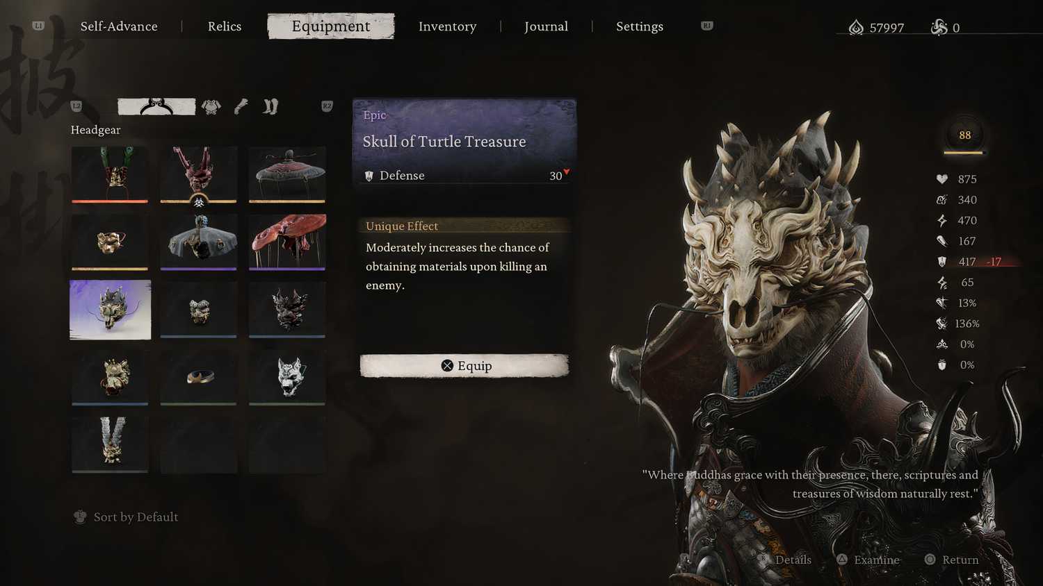 Несмотря на то, что сокровище Черепа Черепахи является экипировкой, повышающей шанс выпадения материалов, сам Череп Черепахи является головным убором, который с большой вероятностью выпадет из определенного Малого Яогуая. Раньше всего его можно получить в третьей главе после достижения Дороги долголетия в Долине экстаза. От святилища хранителя идите к статуям и двигайтесь налево, пока не дойдете до деревянных ворот Тори. Пройдите мимо них и, приблизившись к другим воротам Тори, справа от вас появится враг - Сокровище Черепахи.