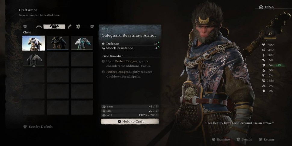 Наборы доспехов открываются сразу, что позволяет вам увидеть различные характеристики каждого предмета и общую пользу от набора доспехов. Практически для каждого предмета брони потребуется шелк, поэтому лучше сразу накопить его и добывать при любой возможности. После создания доспехов шелк уже не вернуть, поэтому всегда проверяйте, сколько у вас шелка, прежде чем тратить его на создание доспехов, с которыми вы потом останетесь.