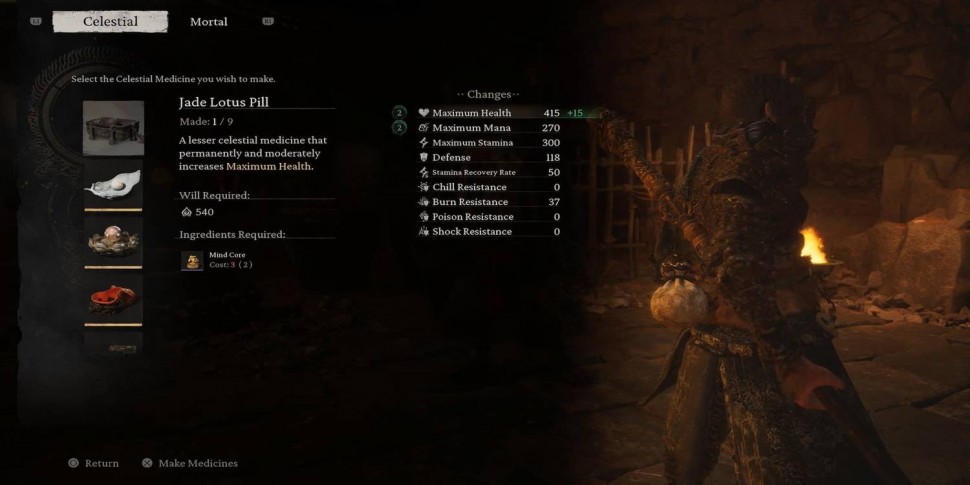 Когда у вас будет немного ядер разума, найдите собаку Зю, которая используется для изготовления лекарств. Его иконка появится рядом со святилищем, к которому он ближе всего находится в данной главе, например в подвале во второй главе. Поговорите с ним и выберите «Сделать лекарство», затем выберите «Небесное лекарство». Любое из этих лекарств можно купить за ядра разума, чтобы получить прибавку к статам, показанным в правой части экрана.