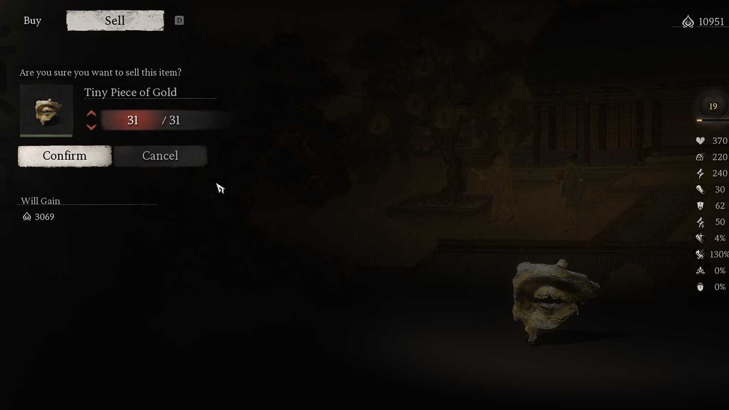 Взамен вы получите воли - валюту, которая используется для покупки брони и улучшения духов. За каждую проданную крошечную крупицу золота вы получите 99 воли.