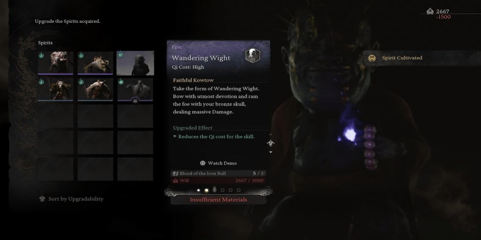 Как и экипировку и броню в Black Myth: Wukong, духов можно улучшать, чтобы они наносили больше урона или потребляли меньше ци. Однако для этого нужно собрать необходимые материалы, а также необходимое количество Воли.