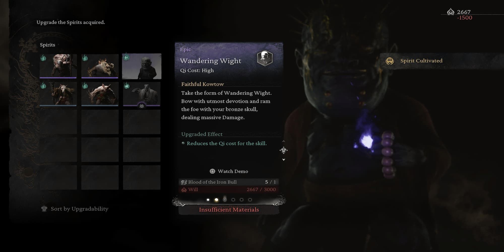 Как и экипировку и броню в Black Myth: Wukong, духов можно улучшать, чтобы они наносили больше урона или потребляли меньше ци. Однако для этого нужно собрать необходимые материалы, а также необходимое количество Воли.