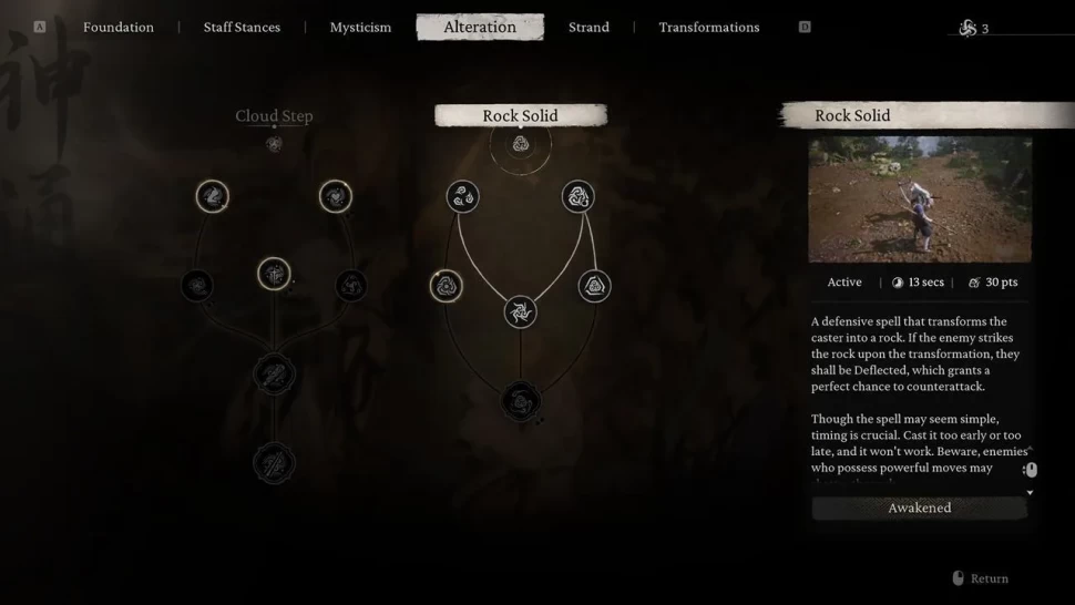 Заклинание парирования «Твердый камень» обладает следующими талантами и перками в Black Myth Wukong:
