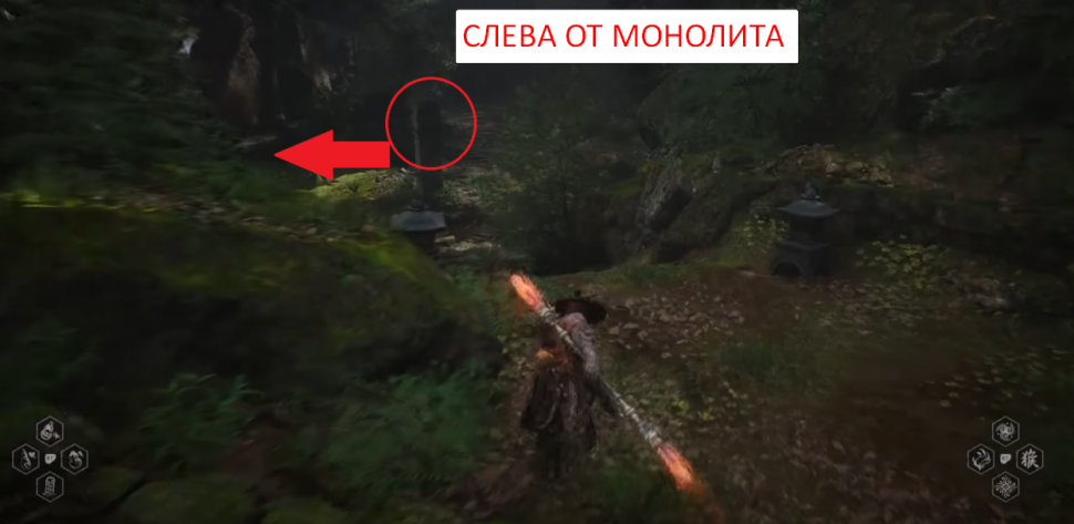 Быстро переместитесь к святилищу Черных холмов в Бамбуковой роще и следуйте по наклонной тропинке сразу налево после появления (прямо вы повернетесь лицом в другую сторону от святилища). Продолжайте идти, пока не достигнете открытой местности с каменным монолитом посередине.