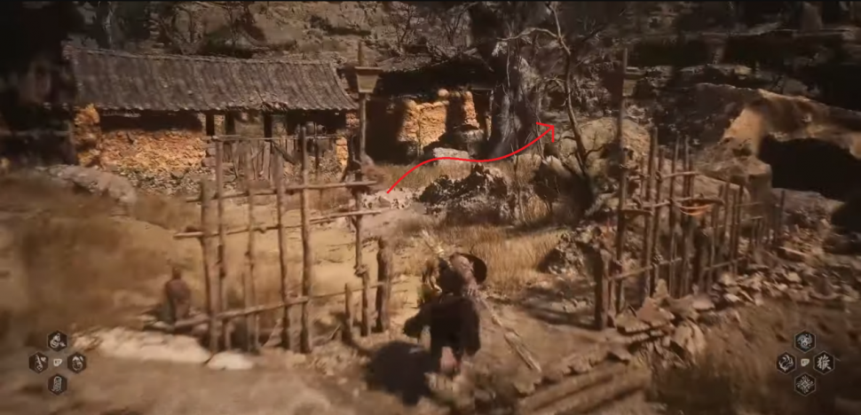 Идите по пути, показанному на изображениях. Вам нужно добраться до самого центра деревни, где находится небольшой колокольный домик. Конь Гуаи стоит возле огромного колокола. Также не обращайте внимания на всех врагов по пути, просто бегите вперед.