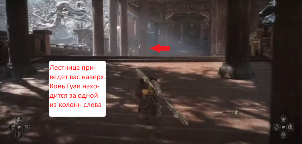 Когда вы начнете третью главу Black Myth Wukong, вам не сразу удастся найти Лошадь Гуаи. Пройдите основную часть сюжета, пока не получите доступ к Новому храму Громовержца. Из святилища при входе в храм пройдите через главный вход и мимо боковой статуи. Выйдите на внешнюю сторону храма и продолжайте идти вперед.