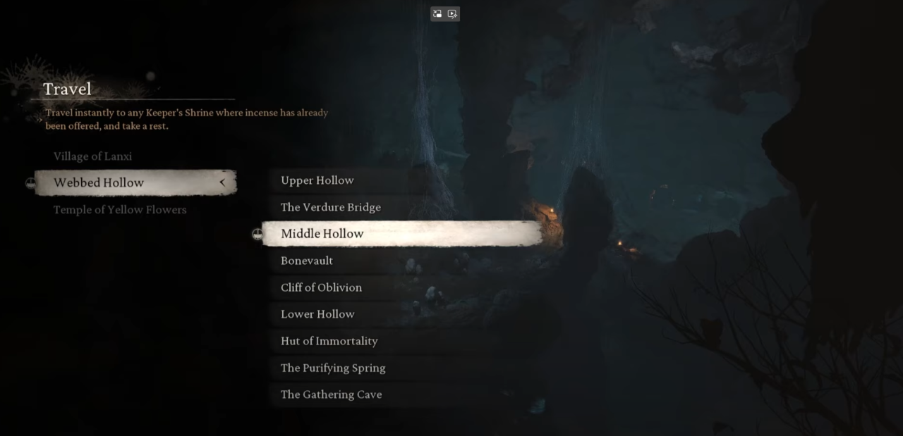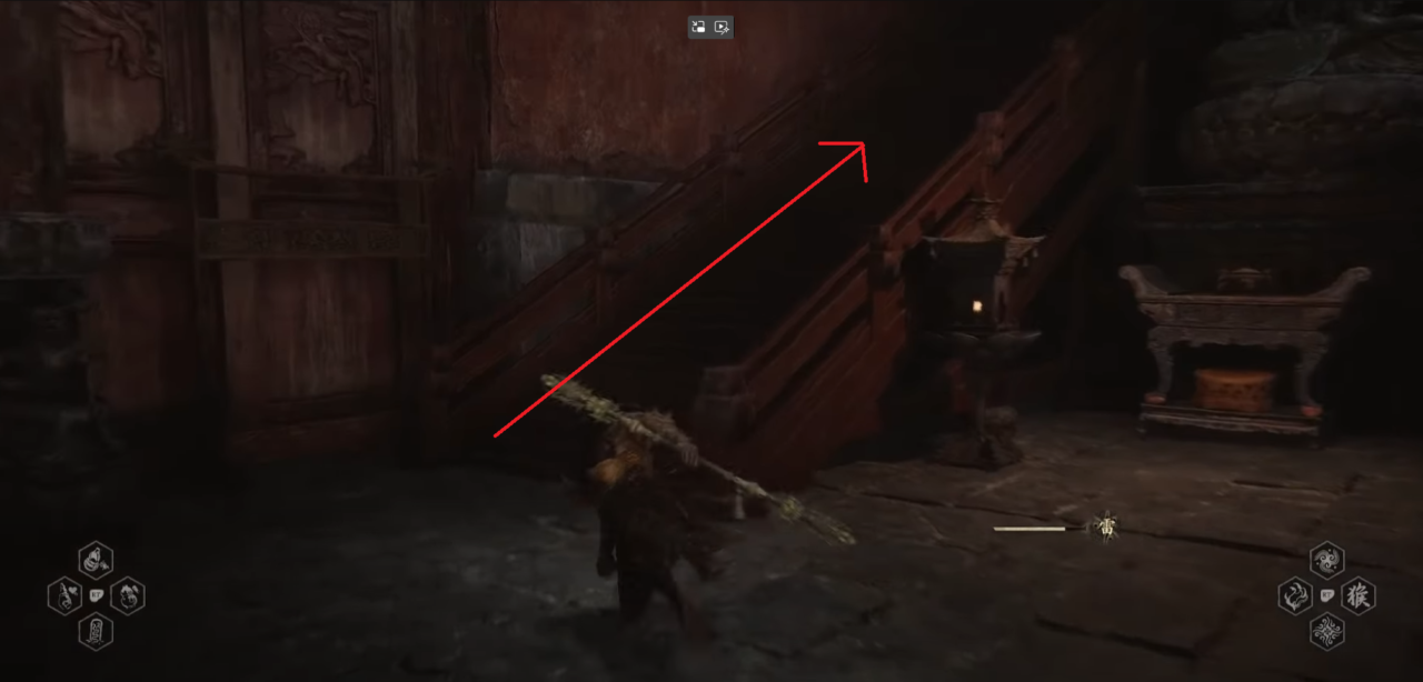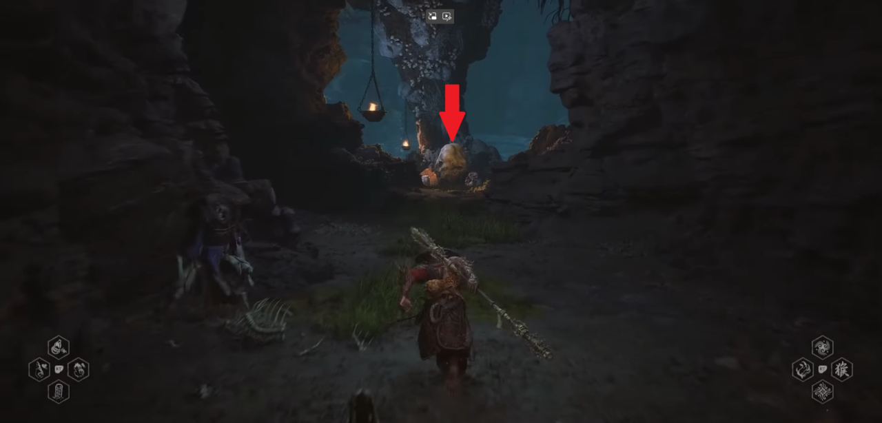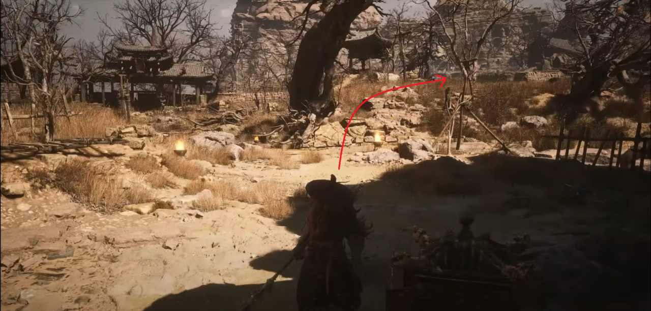 Продолжайте играть в главу 4 Black Myth Wukong, пока не получите доступ к святилищу Средней Лощины в Паутинной Лощине. Направляйтесь вправо от святилища и продолжайте двигаться вперед, пока не дойдете до факела слева.