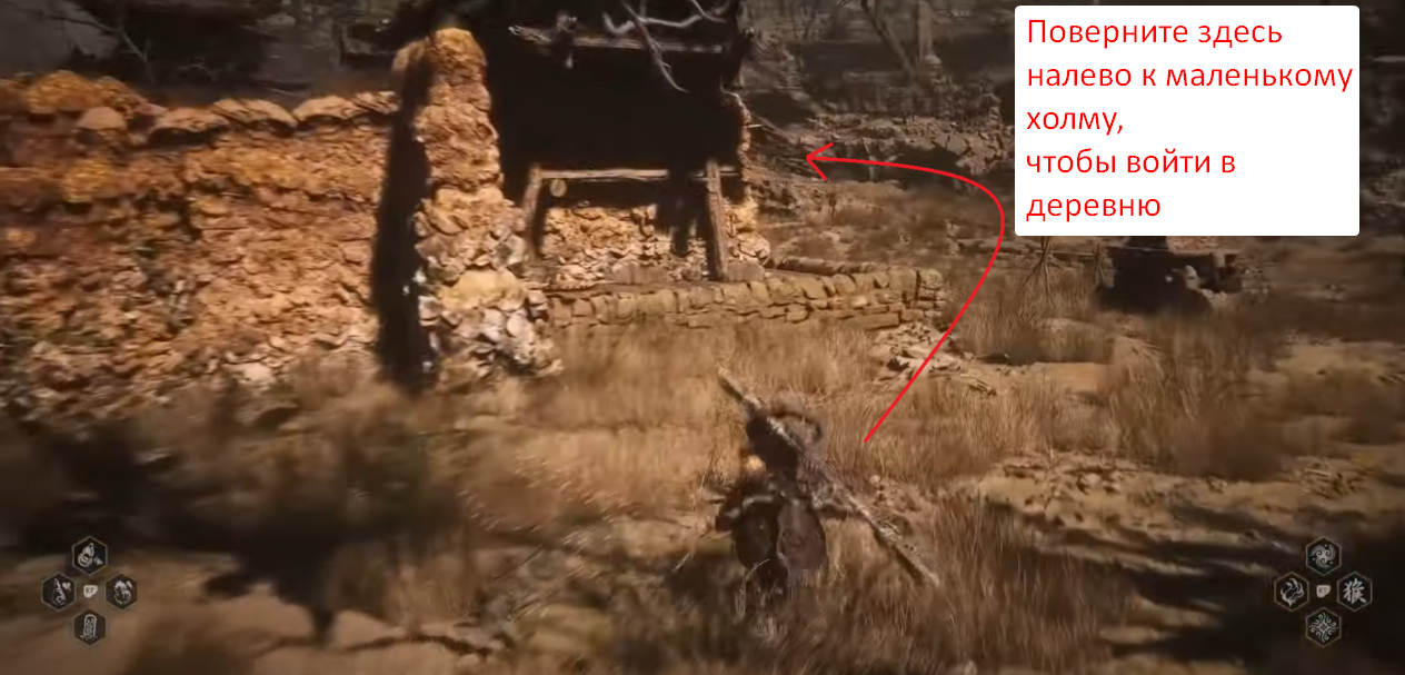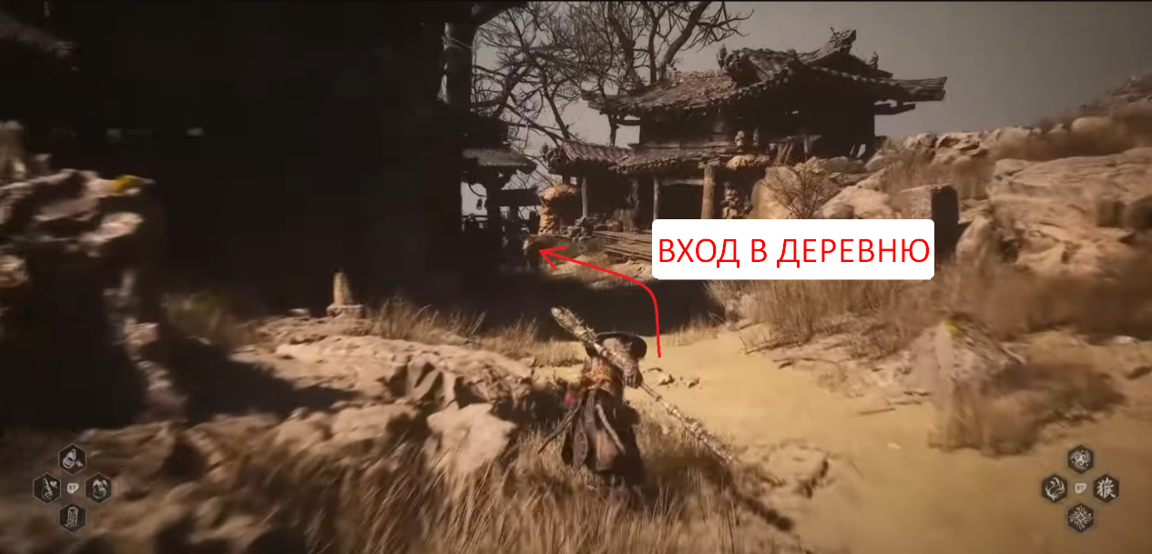 Идите по пути, показанному на изображениях. Вам нужно добраться до самого центра деревни, где находится небольшой колокольный домик. Конь Гуаи стоит возле огромного колокола. Также не обращайте внимания на всех врагов по пути, просто бегите вперед.