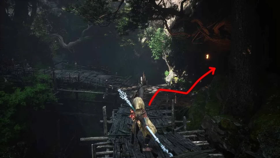 От Святилища Белого Тумана идите вперед по шатким деревянным мостикам. На пути будет развилка: вы можете пойти налево, чтобы забрать Небесную пилюлю из небольшого сундука, прямо, чтобы продолжить уровень, или направо, чтобы войти в небольшую пещеру, где вы найдете обезьянку Шэнь и место для медитации. Обезьяна Шен остается в этой пещере после того, как вы ее нашли, так что вы можете свободно вернуться, чтобы навестить ее в последующих главах.