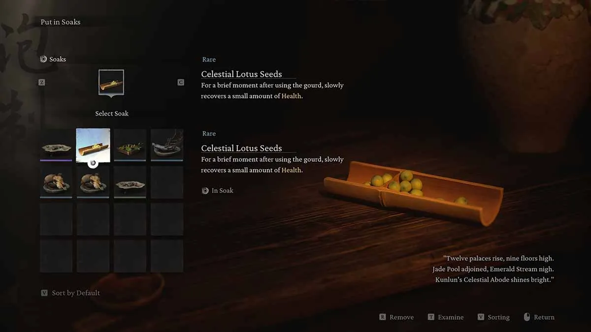 Кроме того, вы можете усилить эффект своей целебной горлянки, добавив в нее соки - еще один ингредиент, который вы найдете, исследуя мир, часто собирая травы. Чтобы добавить соки, поговорите с обезьяной Шэнь или отдохните в святилище, а затем выберите опцию «Заварить».