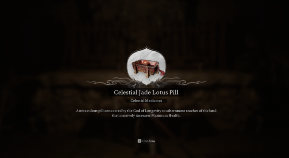 - Пилюля нефритового лотоса: Увеличивает максимальный запас здоровья на 15 единиц.