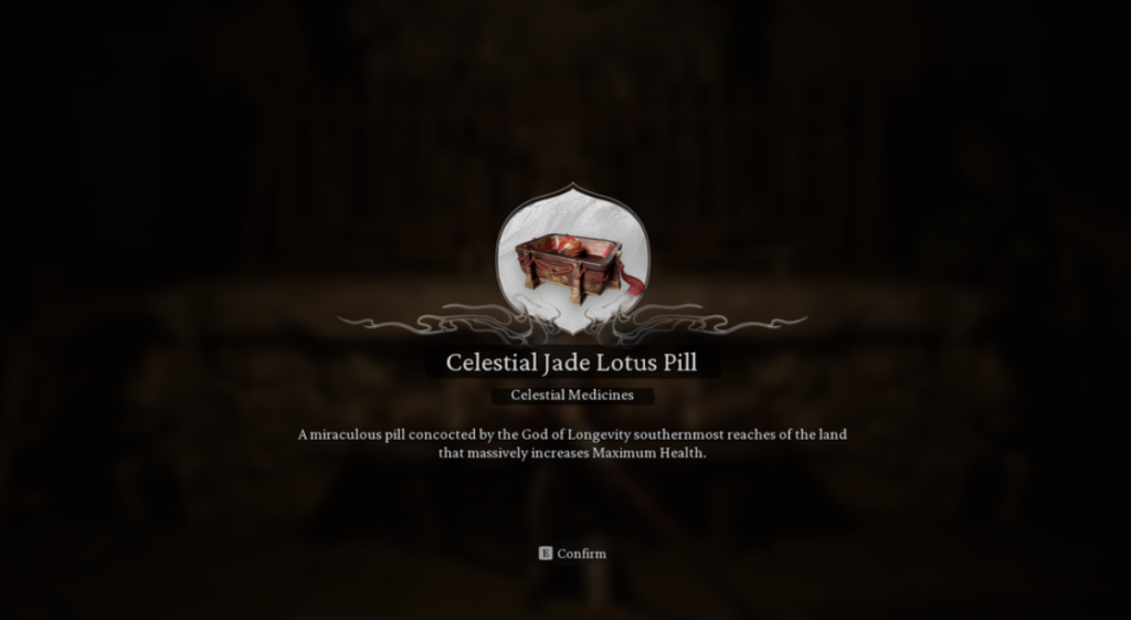 - Пилюля нефритового лотоса: Увеличивает максимальный запас здоровья на 15 единиц.