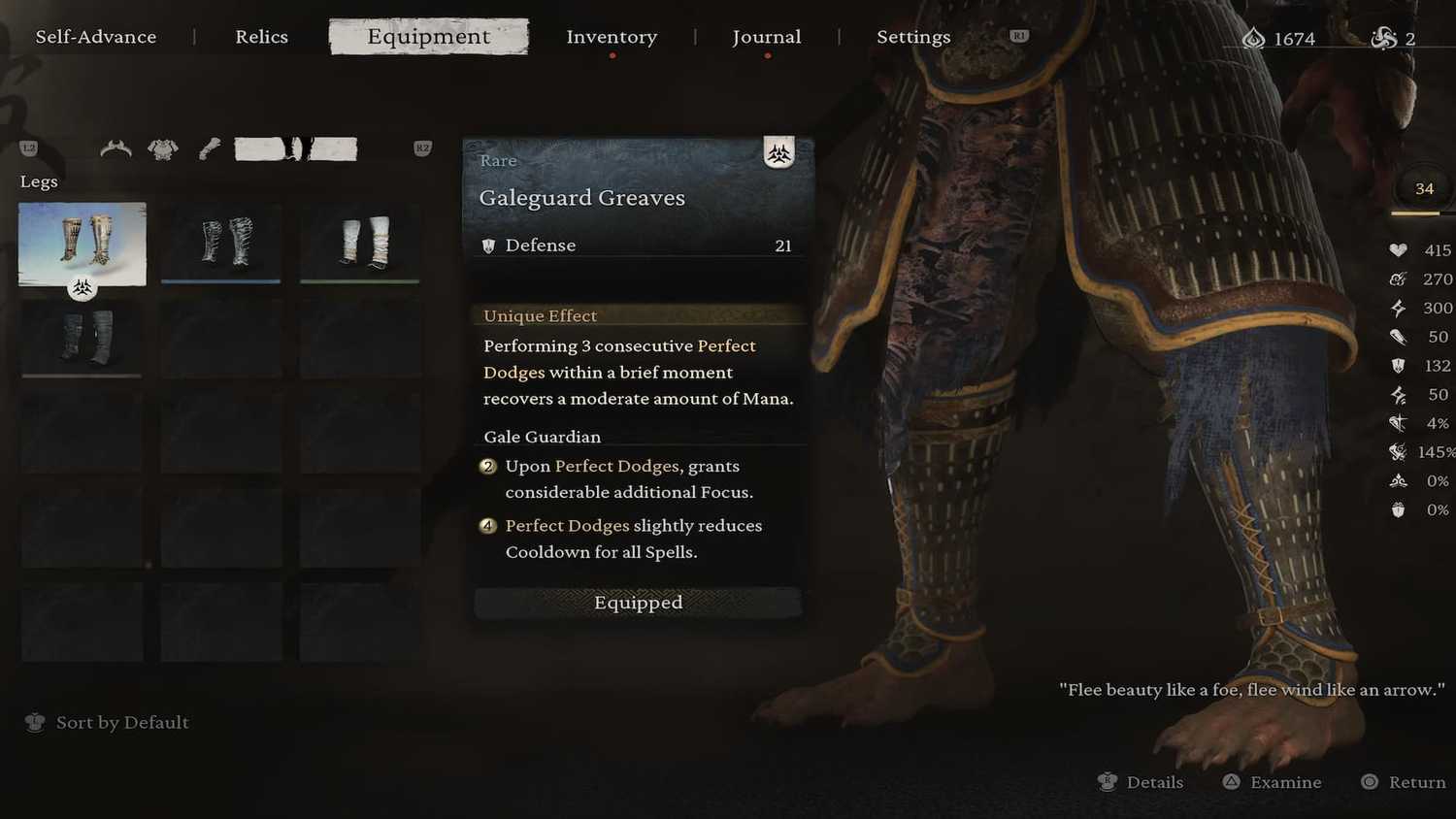 Поскольку уклоняться и пытаться добиться идеальных уклонений - это уже то, что игроки будут делать, этот комплект брони просто развивает этот базовый игровой стиль. Сокращение времени действия заклинаний очень помогает в некоторых случаях, а дополнительный фокус помогает усилить мощные атаки в середине боя.