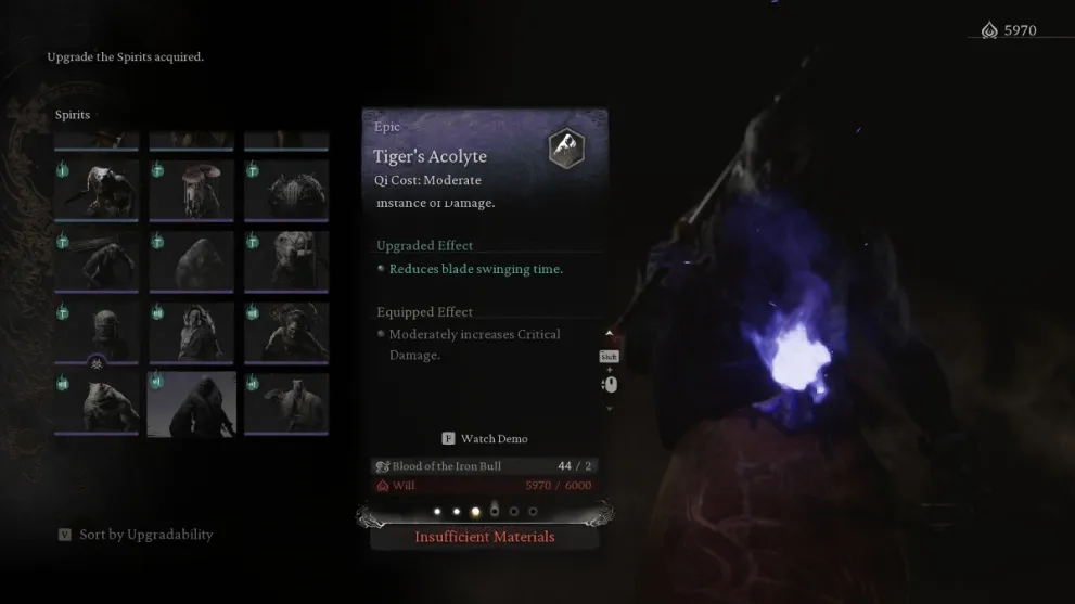 Tiger's Acolyte - еще один отличный дух для этого билда благодаря усилению критического урона. На максимальном уровне этот дух дает бонус +10% к критическому урону, когда он экипирован. Поскольку критический урон - это важнейшая часть максимизации общего потенциала урона, особенно с увеличением шанса крита от «Связующего заклинания», «Аколит тигра» просто бесценен. Хотя его активная способность не является основной, она может принести дополнительную пользу в бою, помогая вам поддерживать высокий урон в различных условиях.