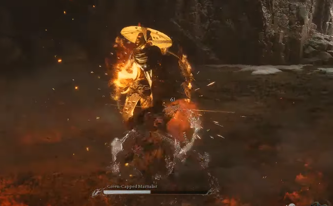 Расположение: Глава 3 > Долина экстаза > Лес Счастья - Из святилища Леса Счастья перед вами будут ворота. Не проходите через ворота, вместо этого спуститесь по склону справа от ворот. Идите по этой тропинке до самого низа, пока не дойдете до пруда/затопленного участка. В правом углу за прудом находятся 3 врага на скалах. Там, где они находятся, вы можете спуститься с обрыва. Внизу вы найдете святилище «Дынное поле». Рядом с ним находится большая статуя Будды, подойдите к ней, чтобы начать бой с боссом - охотником за сокровищами «Зеленокожий мартиалист».