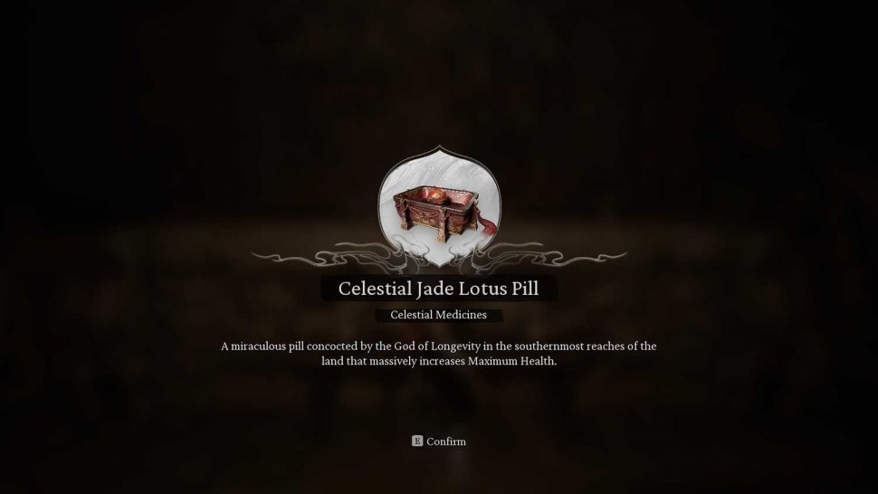 Обязательно исследуйте следующий двор и соберите все, что сможете найти. Здесь будет еще один сундук - разграбьте его и продолжайте путь. Когда вы войдете в следующую комнату, повернитесь налево, чтобы найти гигантскую статую. Взаимодействуйте с ее алтарем, чтобы получить Небесную пилюлю нефритового лотоса. Этот коллекционный предмет автоматически и надолго увеличит ваше здоровье, поэтому важно не упустить его, так как дальнейшее путешествие будет становиться все более сложным.