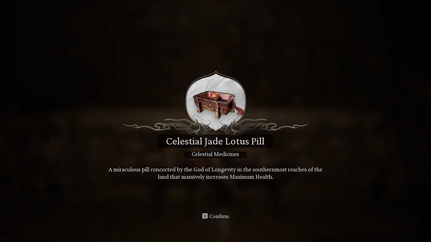 Обязательно исследуйте следующий двор и соберите все, что сможете найти. Здесь будет еще один сундук - разграбьте его и продолжайте путь. Когда вы войдете в следующую комнату, повернитесь налево, чтобы найти гигантскую статую. Взаимодействуйте с ее алтарем, чтобы получить Небесную пилюлю нефритового лотоса. Этот коллекционный предмет автоматически и надолго увеличит ваше здоровье, поэтому важно не упустить его, так как дальнейшее путешествие будет становиться все более сложным.
